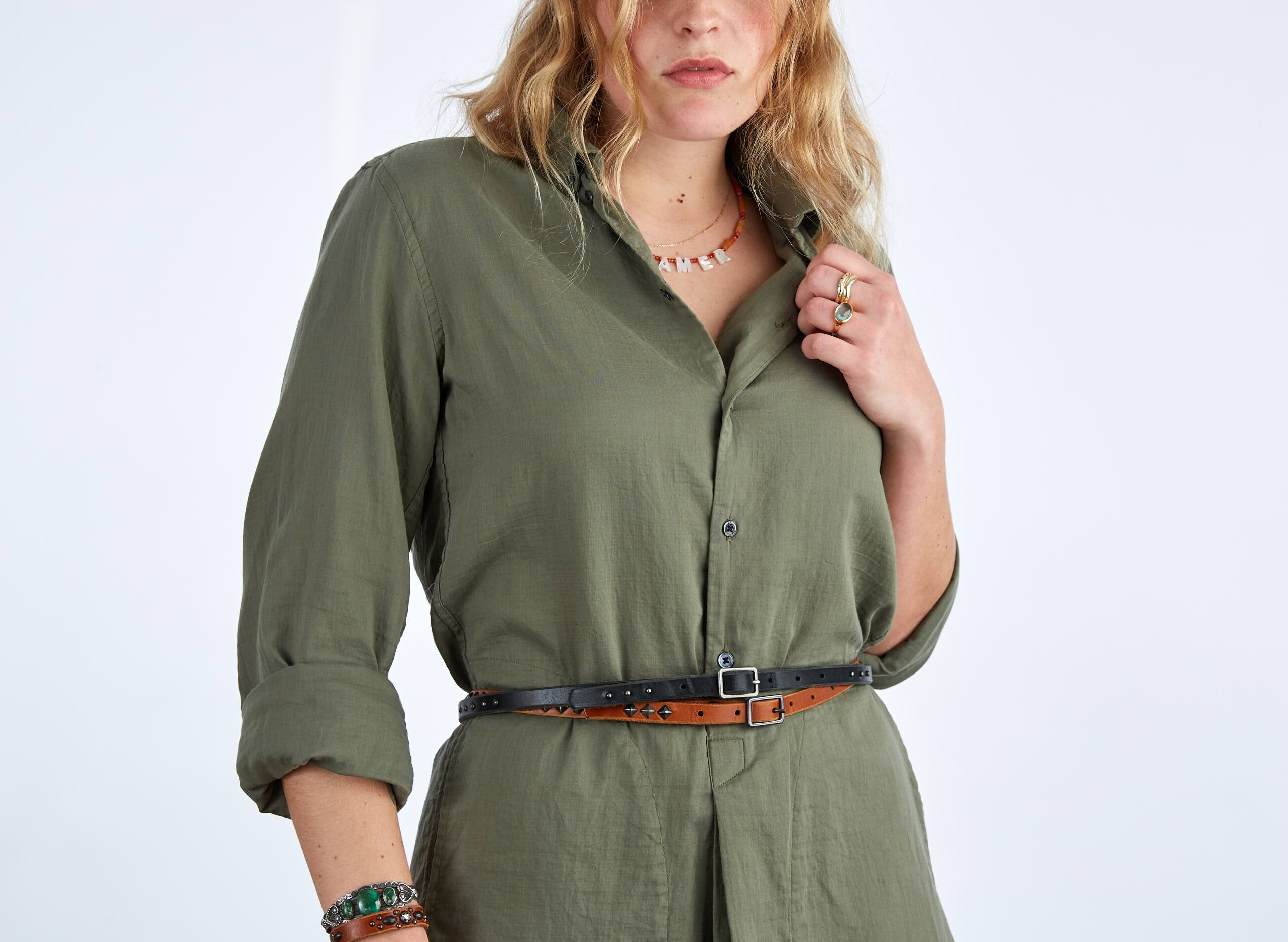 There are moments when a dress, tailored trousers, or high-waisted jeans crave a bit more. Meet “more.” A half-inch of rich Tan leather lined with petite, antiqued pyramid studs adds just the right splash of distinction to an almost-there outfit. It's the perfect finishing touch that goes with everything and works especially well over women's tailored fits.