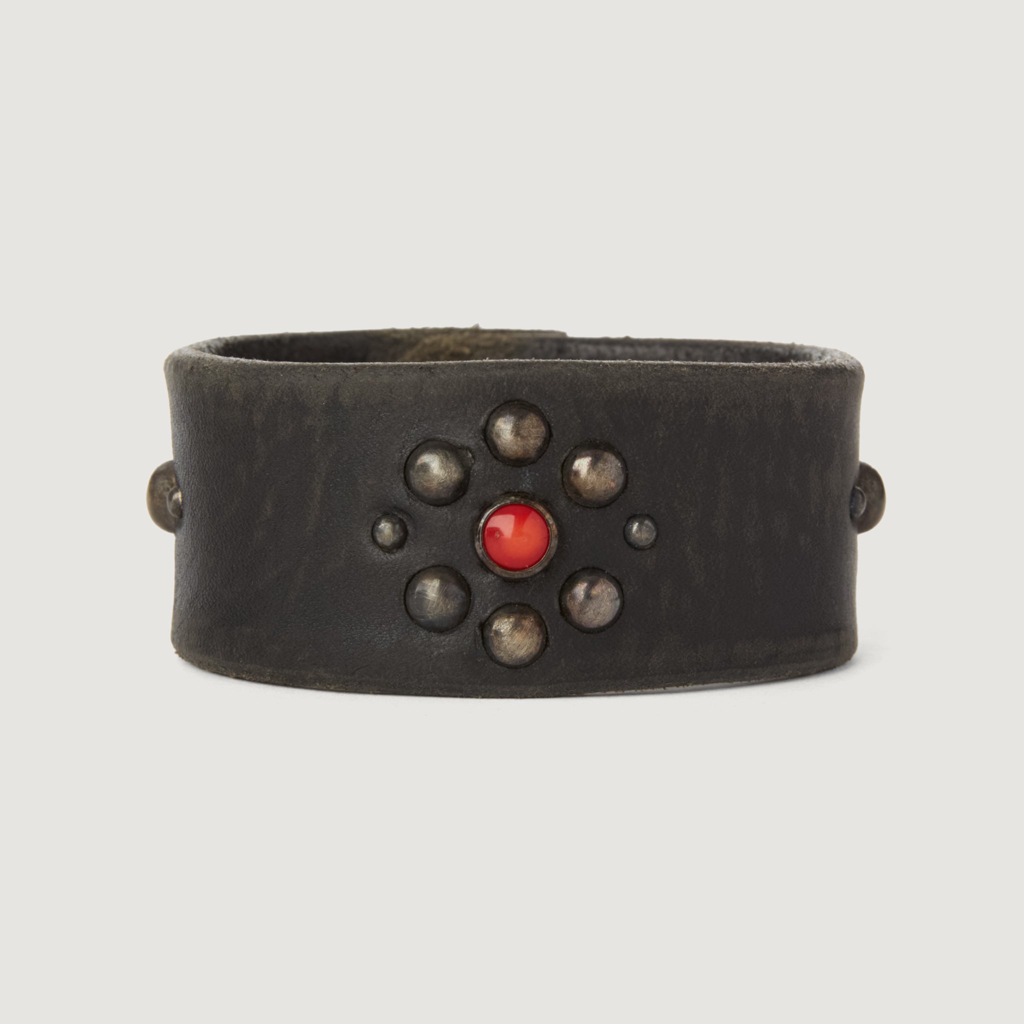 This classic cuff is a medium width crafted on black leather and offers a simple, rugged style. The centerpiece of the cuff is a red cabochon stone encircled by small studs in a simple pattern. Smaller studs are spaced evenly along the band, adding balance and subtle decoration. The overall look is minimalist yet strong, with a vintage feel.