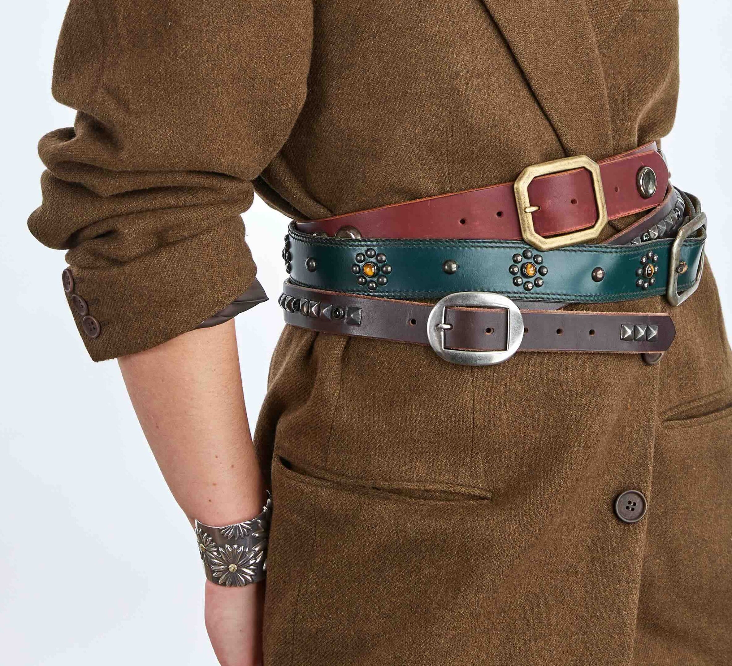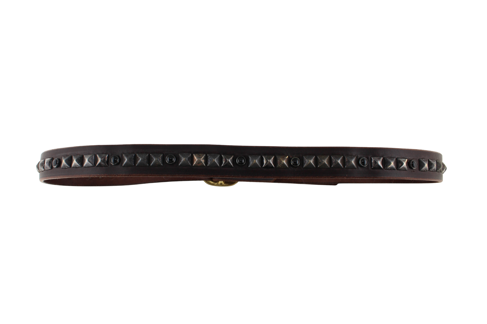 Style 015: Repeating pyramid studs and polished black stones on an Espresso belt