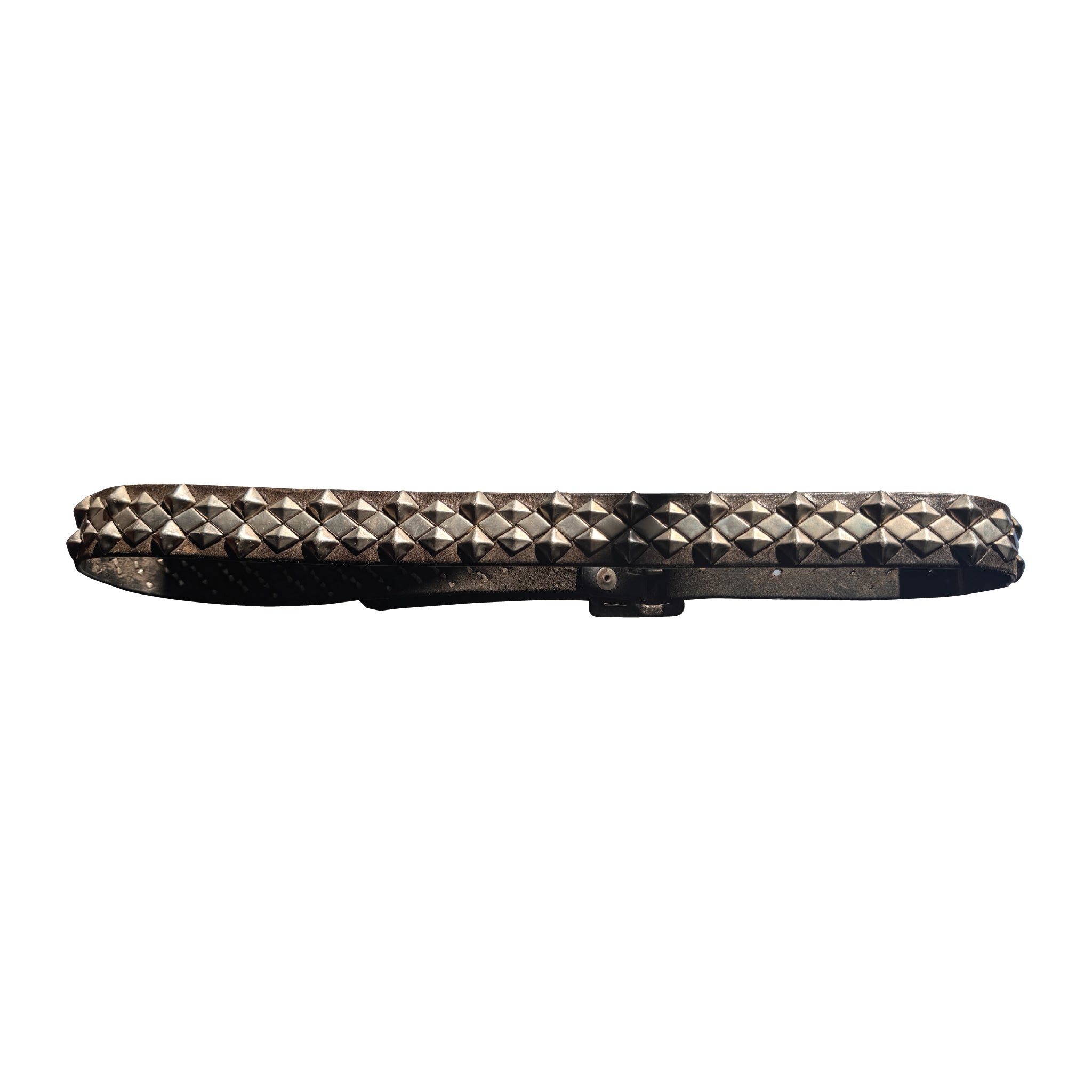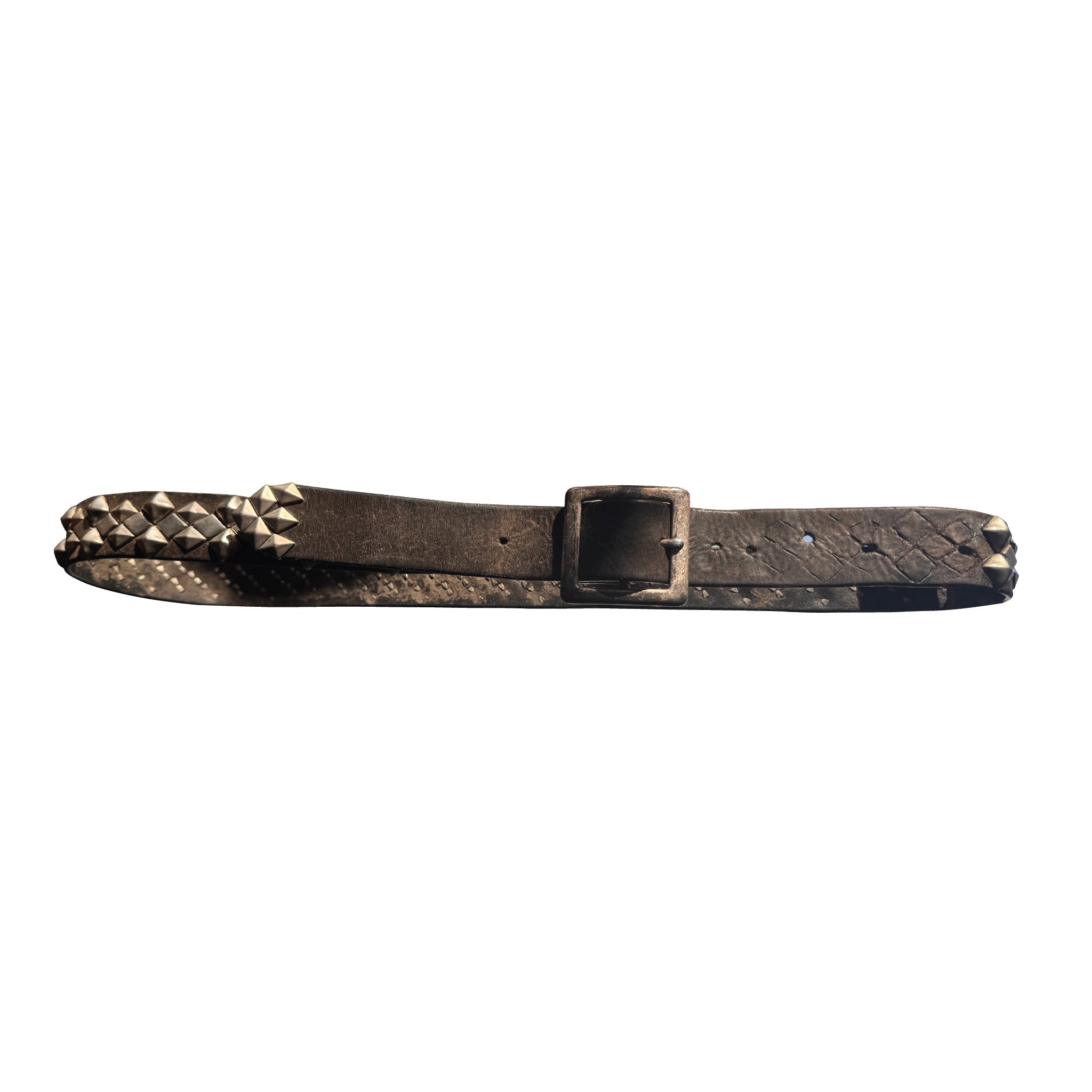 A sleek black belt with a "reptilian" like pattern. Tight, pyramid studs with faceted surfaces are evenly spaced rows along the strap, giving the piece a sharp, dimensional texture. The look is bold and industrial with a rugged edge that maintains structure.