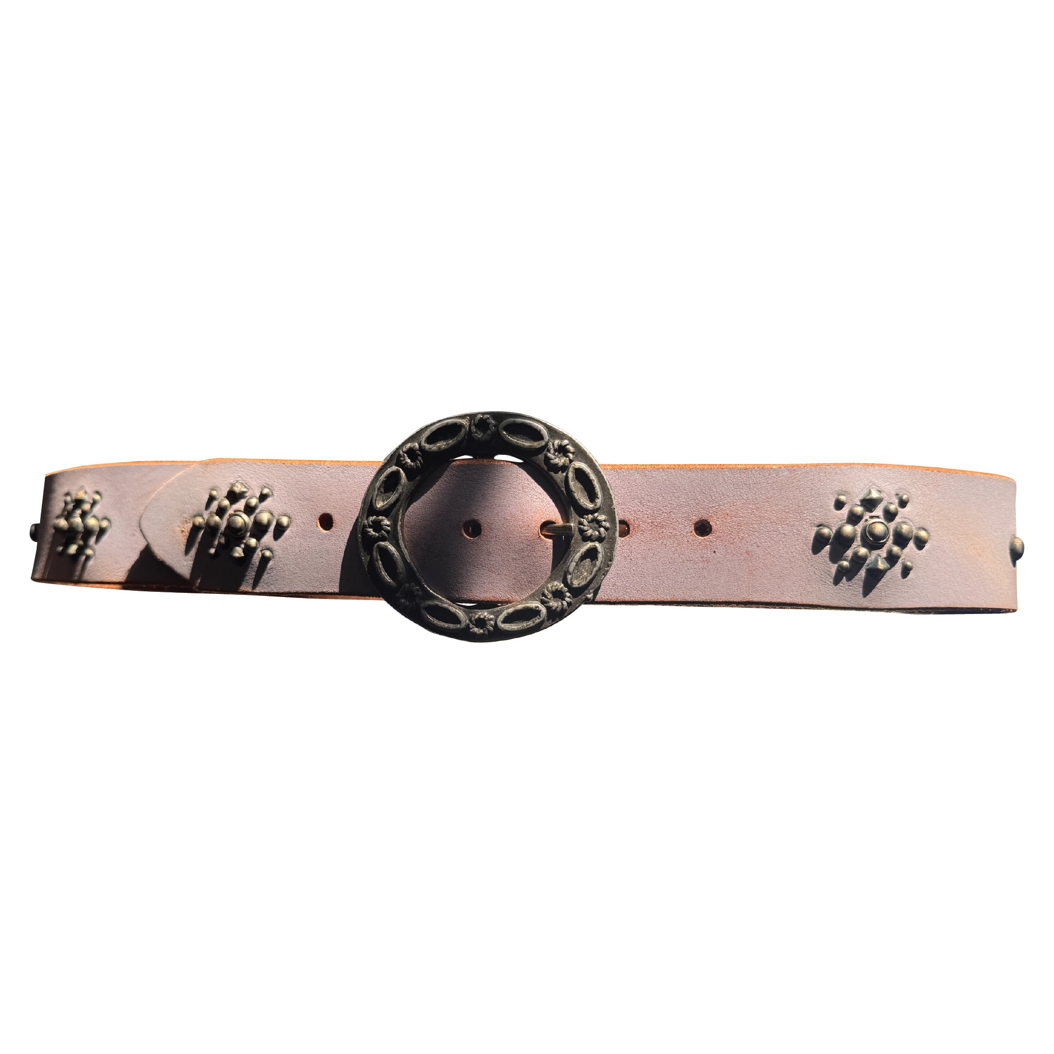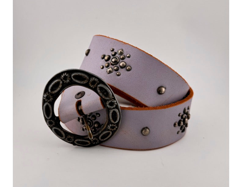 V16: Vintage belt on lavender leather with small studding and engraved oval buckle