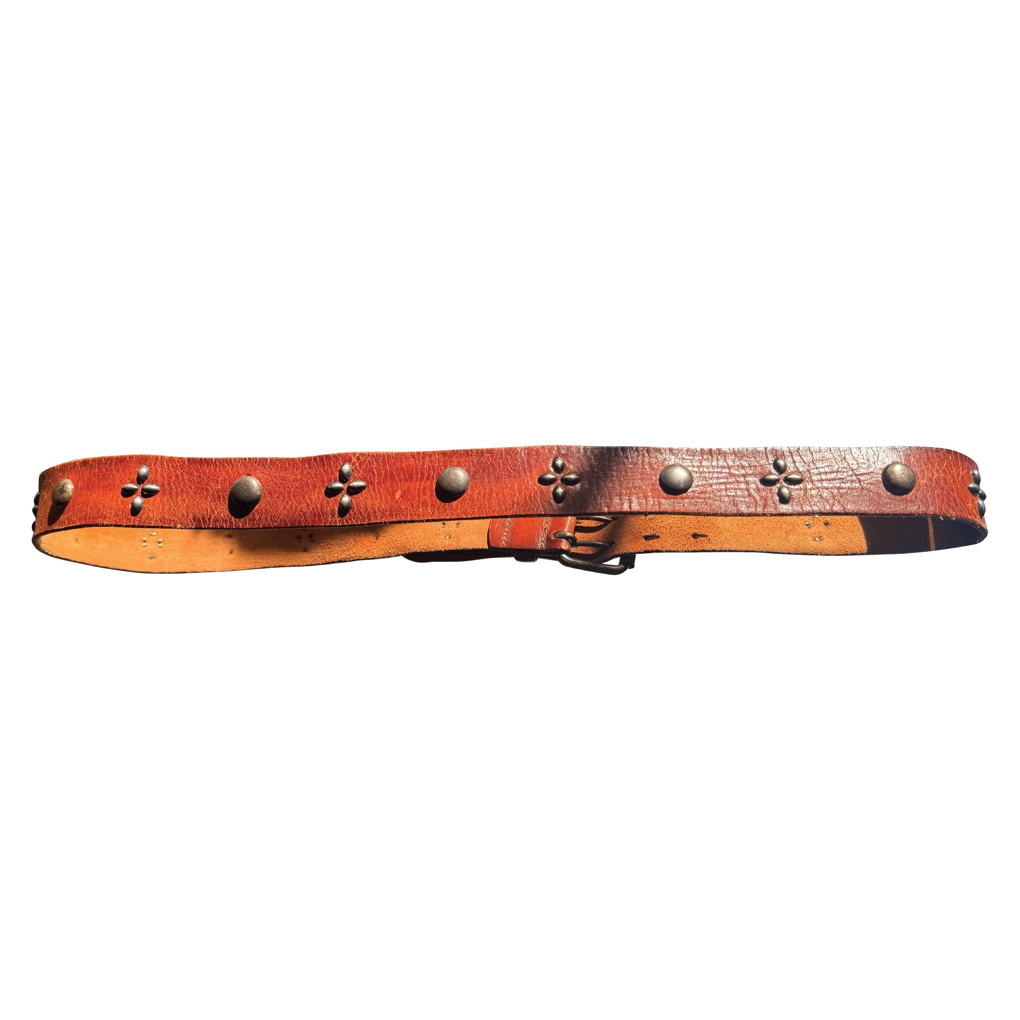 The vintage affect of this rich, warm brown leather with a naturally distressed finish appears in a raw, tonal variation across the surface. The underside shows a softer, suede-like interior in a lighter tan hue, highlighting the thickness and quality of the hide. Antiqued studs accent the strap in a mix of small black bottlecaps, round rivets and petal-shaped groupings. The metal elements have a matte, weathered patina that blends seamlessly with the aged leather. The double-pronged buckle is finished in an antiqued brass and blackened metal combination.